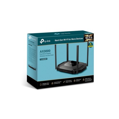 TP-Link TL-WA3001. 2.4 GHz, 5 GHz, Velocità massima di trasferimento dati: 2402 Mbit/s. Algoritmi di sicurezza supportati: SNMP, WPA, WPA-Enterprise, WPA2, WPA2-Enterprise, WPA3. Supporto Power over Ethernet (PoE). Colore del prodotto: Nero