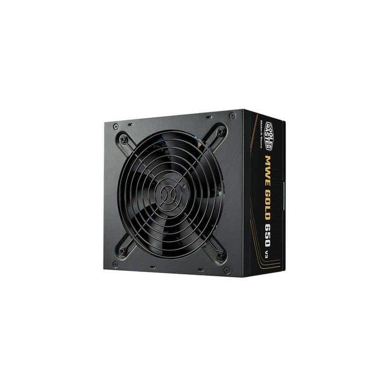 Cooler Master MWE Gold V3 ATX 3.1 Non-Modular Series. Potenza totale: 650 W, Tensione di ingresso AC: 100 - 240 V, Frequenza di ingresso AC: 50/60 Hz. Connettore scheda madre: 24-pin ATX, Lunghezza del cavo di alimentazione della scheda madre: 50 cm, Lunghezza del cavo di alimentazione SATA: 400,550,700 mm. Utilizzo: PC/server, Fattore di forma dell'unità di alimentazione (PSU): ATX, Certificazione 80 PLUS: 80 PLUS Gold. Colore del prodotto: Nero, Tipo di raffreddamento: Attivo, Diametro del ventilatore: 12 cm. Certificati di conformità: BIS, BSMI, CCC, China Compulsory Certification (CCC), EAC, Federal Communications Commission..., Certificazione: ErP 2014 Lot 3