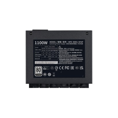 Cooler Master V SFX Platinum 1100. Potenza totale: 1100 W, Tensione di ingresso AC: 100 - 240 V, Frequenza di ingresso AC: 50 - 60 Hz. Connettore scheda madre: 24-pin ATX, Lunghezza del cavo di alimentazione della scheda madre: 30 cm, Lunghezza del cavo di alimentazione SATA: 100,250,400,550,700 mm. Utilizzo: PC/server, Fattore di forma dell'unità di alimentazione (PSU): SFX, Certificazione 80 PLUS: 80 PLUS Platinum. Colore del prodotto: Nero, Tipo di raffreddamento: Attivo, Diametro del ventilatore: 9,2 cm. Certificazione: ErP 2014 Lot 3, TUV, cTUVus, CE, FCC, BSMI, CCC, EAC, UKCA