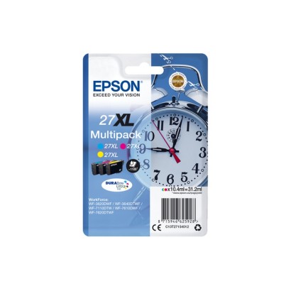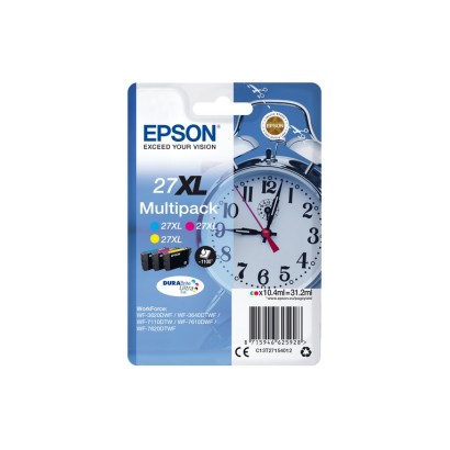 Epson Alarm clock Multipack Sveglia 3 colori Inchiostri DURABrite Ultra 27XL. Tipo di inchiostro a colori: Inchiostro a base di pigmento, Tipo di cartuccia: Resa elevata (XL), Tipo di fornitura: Confezione multipla, Resa in pagine dell'inchiostro a colori: 1100 pagine, Volume dell'inchiostro a colori: 10,4 ml, Colori di stampa: Ciano, Magenta, Giallo, Quantità per pacco: 1 pz