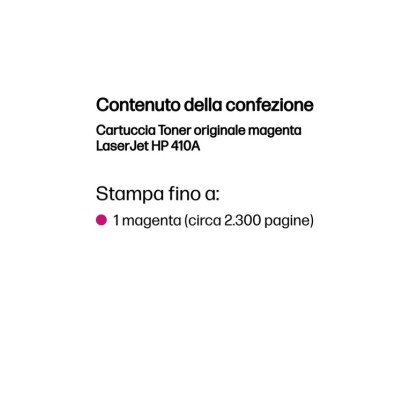 HP Cartuccia Toner originale magenta LaserJet 410A. Resa in pagine del toner a colori: 2300 pagine, Colori di stampa: Magenta, Quantità per pacco: 1 pz