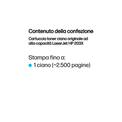 HP Cartuccia toner ciano originale ad alta capacità LaserJet 203X. Resa in pagine del toner a colori: 2500 pagine, Colori di stampa: Ciano, Quantità per pacco: 1 pz