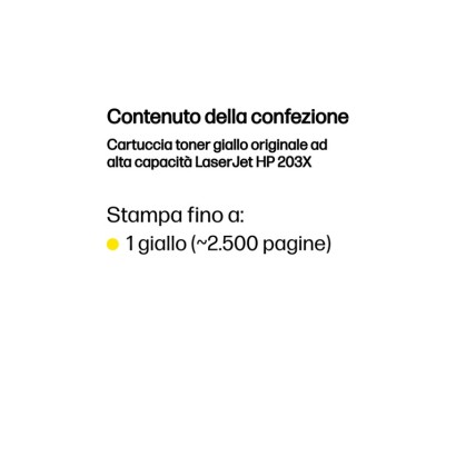 HP LaserJet Cartuccia toner giallo originale ad alta capacità 203X. Resa in pagine del toner a colori: 2500 pagine, Colori di stampa: Giallo, Quantità per pacco: 1 pz