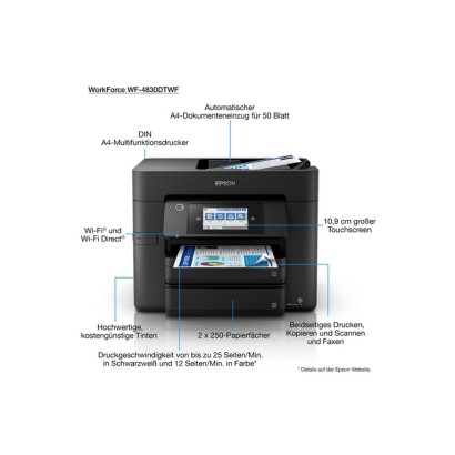 Epson WorkForce Pro WF-4830DTWF. Tecnologia di stampa: Ad inchiostro, Stampa: Stampa a colori, Risoluzione massima: 4800 x 2400 DPI, Velocità di stampa (colore, qualità normale, A4/US Letter): 22 ppm. Copia: Copia a colori. Scansione: Scansione a colori, Risoluzione di scansione ottica: 1200 x 1200 DPI. Massimo formato carta serie ISO A: A4. Wi-Fi. Colore del prodotto: Nero