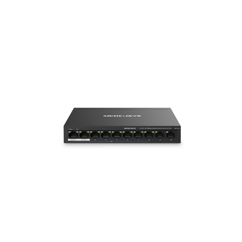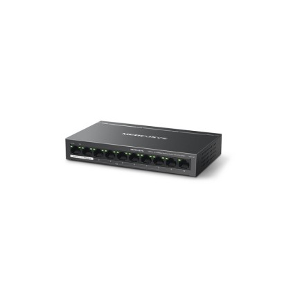 Mercusys MS110P. Tipo interruttore: Gestito. Tipo di porte RJ-45: Fast Ethernet (10/100), Quantità di porte RJ-45: 10. Full duplex. Dimensioni tavola MAC: 2000 voci. Standard di rete: IEEE 802.3af, IEEE 802.3at, IEEE 802.3x. Voltaggio input DC: 53.5 V. Supporto Power over Ethernet (PoE). Montabile a parete