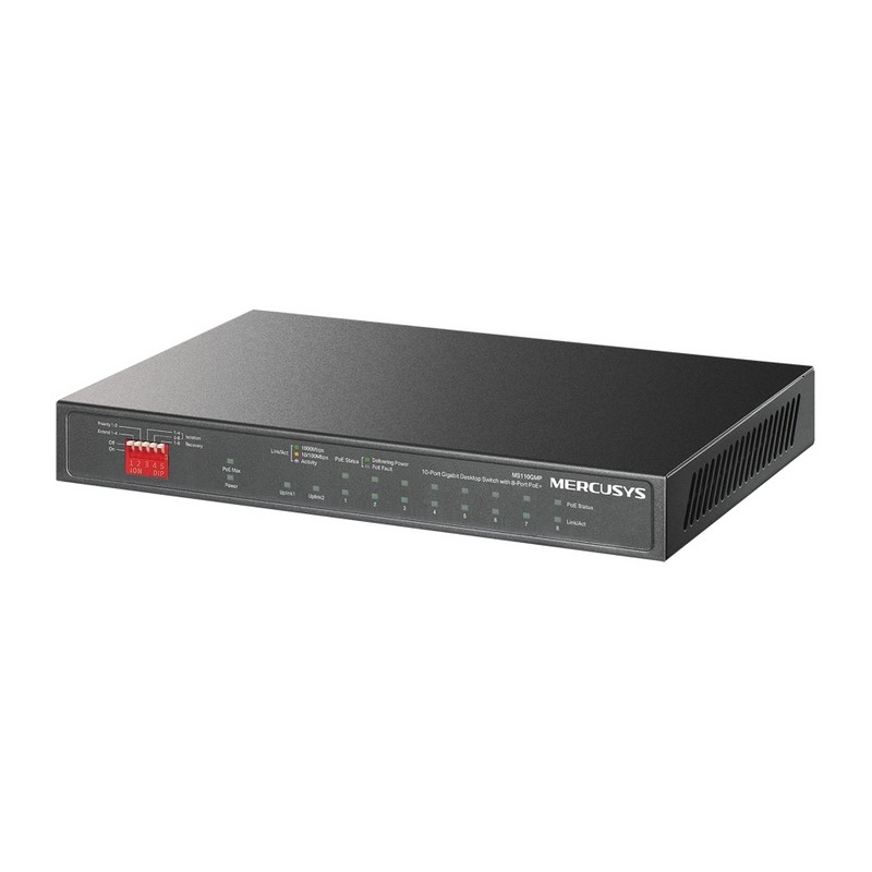 Mercusys MS110GMP. Tipo di porte RJ-45: Gigabit Ethernet (10/100/1000), Quantità di porte RJ-45: 10. Full duplex. Dimensioni tavola MAC: 4000 voci, Capacità di commutazione: 20 Gbit/s. Standard di rete: IEEE 802.3af, IEEE 802.3at, IEEE 802.3x. Voltaggio input DC: 54 V. Supporto Power over Ethernet (PoE). Montabile a parete