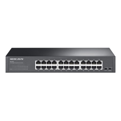 Mercusys MS124GS. Tipo di porte RJ-45: Gigabit Ethernet (10/100/1000), Quantità di porte RJ-45: 24. Dimensioni tavola MAC: 8000 voci, Capacità di commutazione: 48 Gbit/s. Standard di rete: IEEE 802.1p, IEEE 802.3ab, IEEE 802.3u, IEEE 802.3x. Connettore di alimentazione: Jack DC-ingresso. Montaggio rack