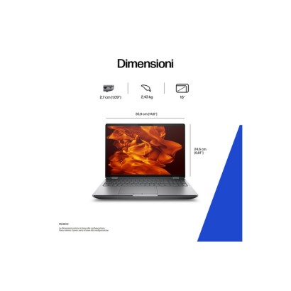 HP ZBook Fury G1i 16 inch Mobile Workstation PC Wolf Pro Security Edition. Tipo di prodotto: Workstation mobile, Fattore di forma: Clamshell. Famiglia processore: Intel Core Ultra 7, Modello del processore: 255HX. Dimensioni diagonale schermo: 40,6 cm (16"), Tipologia HD: WUXGA, Risoluzione del display: 1920 x 1200 Pixel. RAM installata: 32 GB, Tipo di RAM: DDR5-SDRAM. Capacità totale di archiviazione: 1 TB, Supporto di memoria: SSD. Modello scheda grafica integrata: Intel Graphics, Scheda grafica dedicata: NVIDIA RTX Pro 1000 Blackwell. Sistema operativo incluso: Windows 11 Pro. Colore del prodotto: Argento