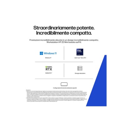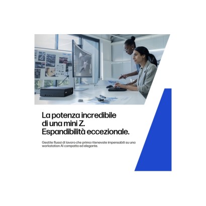HP Z2 Mini G1i Wolf Pro Security Edition. Famiglia processore: Intel Core Ultra 7, Modello del processore: 265. RAM installata: 32 GB, Tipo di RAM: DDR5-SDRAM, Velocità memoria: 6400 MHz. Capacità totale di archiviazione: 1 TB, Supporto di memoria: SSD. Modello scheda grafica integrata: Intel Graphics, Scheda grafica dedicata: NVIDIA RTX A400. Sistema operativo incluso: Windows 11 Pro. Alimentazione: 280 W. Tipo di case: Mini PC. Tipo di prodotto: Stazione di lavoro. Peso: 2,4 kg. Colore del prodotto: Nero