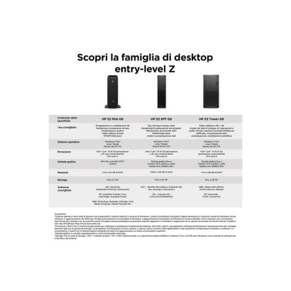 HP Z2 G9. Famiglia processore: Intel® Core™ i7, Modello del processore: i7-14700. RAM installata: 16 GB, Tipo di RAM: DDR5-SDRAM, Velocità memoria: 4800 MHz. Capacità totale di archiviazione: 512 GB, Supporto di memoria: SSD. Modello scheda grafica integrata: Intel UHD Graphics 770. Sistema operativo incluso: Windows 11 Pro. Alimentazione: 700 W. Tipo di case: Tower. Tipo di prodotto: Stazione di lavoro. Peso: 7,2 kg. Colore del prodotto: Nero